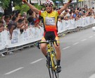 Km 60: | Foratura di Alessandro Covi,mentre la coppia di testa e' ad un chilometro dal passaggio sotto lo striscione di arrivo per il suono della campana |